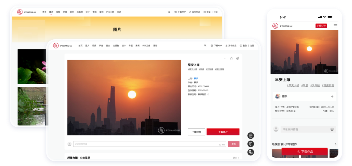 上海城市形象资源共享平台IP SHANGHAI由澎湃新闻运营和独家技术支持,涵盖电脑/手机网页端、APP端。平台汇聚海量图片、视频、声音、文字、出版物、设计素材等资源,打造上海形象的聚合资源库。